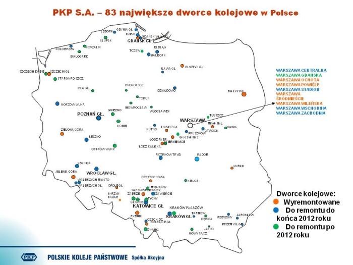 Kalendarz inwestycji dworcowych planowanych przez PKP wygląda naprawdę nieźle. Nie jest tajemnicą, że dużą rolę w planach modernizacyjnych odgrywają współorganizowane przez Polskę mistrzostwa Euro 2012, dzięki którym udało się skonkretyzować rozkład budowlano-remontowy obiektów kolejowych. 2012 rok stał się pewną datą graniczną wyznaczającą harmonogram prac i wymuszającą jak największe zaangażowanie inwestycyjne na terenie całego kraju. Mapa inwestycji przygotowana przez PKP obejmuje więc zarówno miasta dla mistrzostw strategiczne, takie jak Warszawa, Wrocław czy Poznań, jak i te mniejsze, które nie biorą bezpośredniego udziału w mistrzostwach, takie jak Łódź, Malbork, Piotrków Trybunalski, ale które są przecież nie mniej istotne z punktu widzenia podróżnego. Oczywiste jest bowiem, że przybywający do Polski kibice będą przemierzać ją całą – wzdłuż i wszerz – a opinię na temat kraju będą wyrabiać sobie także wyglądając przez okna. W takiej konfrontacji żadna kampania wizerunkowa nie ma szans.