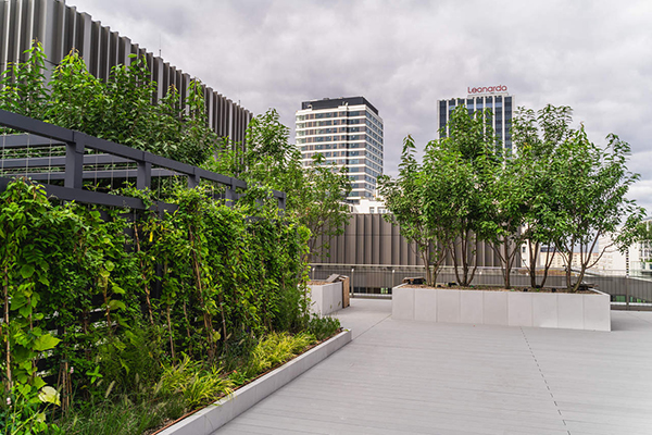 Ściany budynków biurowych, patia, a także wejścia do kompleksu zdobić będą również pnącza – m.in. bluszcz pospolity, winorośl japońska czy słynący z charakterystycznych, dekoracyjnych liści w kształcie serca - kokornak wielkolistny. Zasadzone zostały w specjalnych donicach umieszczonych w ziemi i pnąć się będą po systemie specjalnych mocowań i dedykowanego do tego typu rozwiązań linek metalowych.