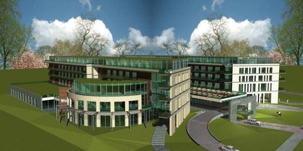 W pięciokondygnacyjnym budynku znajdzie się 308 pokoi (1- i 2-osobowych oraz apartamentów), a hotel będzie mógł przyjąć ponad 600 gości. Obiekt będzie miał kształt trzech równoległych brył – skrzydeł, mieszczących funkcje hotelowe i usługowe. Centralne skrzydło będzie jednokondygnacyjne. Zlokalizowane zostaną w nim gabinety terapeutyczne i kosmetyczne. Skrajne skrzydła (wschodnie i zachodnie) posiadać będą po cztery kondygnacje z pokojami hotelowymi o różnym standardzie oraz pomieszczeniami pomocniczymi. Podzielono je optycznie na część północną, częściowo ukrytą, z loggiami w kształcie łuków, oraz część południową, w której znajdą się pokoje z balkonami. Wszystkie balkony hotelu zostaną wyposażone w bezpieczne dla dzieci balustrady, utrzymane w korespondującej z architekturą obiektu nowoczesnej, minimalistycznej stylistyce (ażurowe balustrady stalowe albo stalowo szklane, barwy szarobeżowej).
