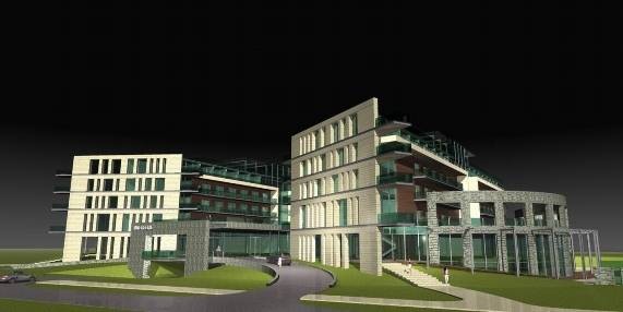 Fasady budynku będą licowane piaskowcem i imitacją naturalnego kamienia na frontowej elewacji północnej. Kolorystyka elewacji czerpie inspiracje z otaczającej obiekt przyrody i utrzymana jest w odcieniach brązów, beżów i szarości. Wszystkie dachy będą płaskie, co daje możliwość wkomponowania niskiej roślinności.