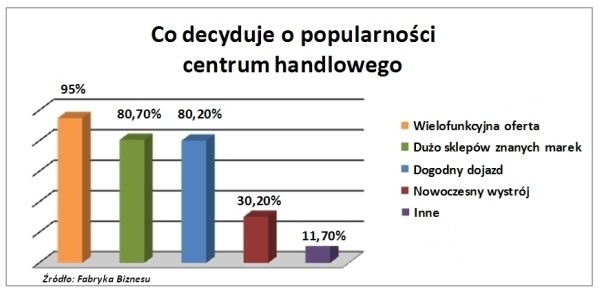 Na wielofunkcyjną ofertę jako czynnik decydujący o popularności centrum handlowego wskazało aż 95 proc. respondentów. Jednocześnie 80,7 proc. badanych za drugie pod względem ważności kryterium uznało dużą liczbę sklepów znanych marek w centrum handlowym, a niemal tyle samo (80,2 proc.) – dogodny dojazd do niego. Zdaniem 30,2 proc. respondentów, duże znaczenie ma nowoczesny wystrój kompleksu, a 11,8 proc. jako istotne wskazało inne czynniki.