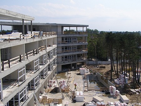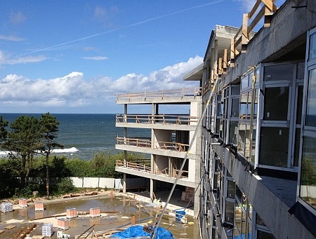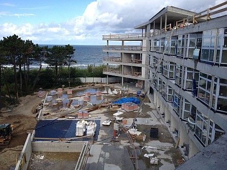 – Do wykopu, nad którym stanął Dune zastosowano ściankę szczelną wraz z odwodnieniem wykopu przy pomocy igłofiltrów. Proces przebiegał sprawnie, jednak pompowanie wody trwało 24 godziny na dobę przez kilka miesięcy – opowiada Damian Kroc Project Manager z firmy Gleeds, zarządzającej przebiegiem procesu budowlanego. Nadziemna część apartamentowca została zaprojektowana w konstrukcji żelbetowej z zastosowaniem m.in. tarcz żelbetowych i słupów z rdzeniem w postaci stalowego profilu. - To technologia niezbędna z racji lokalizacji apartamentowca tuż przy plaży i właściwie na wydmie, jest także dość skomplikowana. Grunt pod budynkiem wzmocniony został ponad 400 betonowymi palami wykonanymi w technologii FDP – mówi Damian Kroc z firmy Gleeds. W trakcie budowy Dune wywieziono aż 22.500 m3 piasku, czyli 2.800 wywrotek. Na budowie stanęły dwa żurawie, jak dotychczas najwyższe jakie kiedykolwiek stały w Mielnie – 50 i 40 metrowy. Zużyto ok. 12.000 m3 betonu wyprodukowanego przez regionalne wytwórnie.