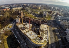 Konstrukcja futurystycznego kompleksu w większej części jest już gotowa. Niedługo rozpocznie się budowa piątego, przedostatniego piętra. Nietypowa bryła OVO Wrocław gładko wpasowuje się w kwartał ulic, co najlepiej widać na zdjęciach lotniczych.