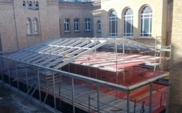 Na terenie głównego dziedzińca budynku powstał już zarys przyszłego Biura Obsługi Klienta w postaci stalowej konstrukcji...