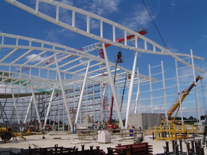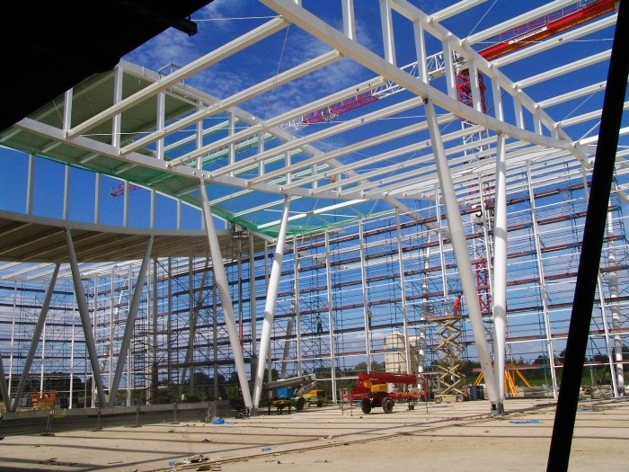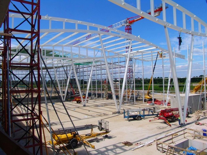 W sierpniu na konstrukcji stalowej będą montowane szklane elementy fasad oraz dachu. Już trwa przykrywanie zadaszenia blachą, na której będzie montowane ocieplenie oraz specjalny system stanowiący wierzchnią warstwę.