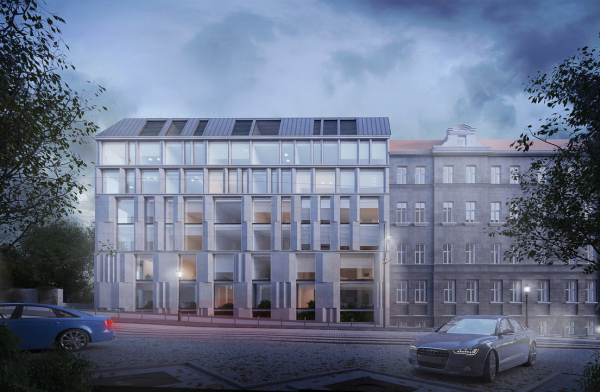 Projektanci biorą pod uwagę wykorzystanie cegły rozbiórkowej z istniejącej kamienicy, którą da się zachować. Cała elewacja ma zostać wykończona z kamienia lub konglomeratów, pozwalających na uzyskanie maksymalnie dużych podziałów płyt. Dodatkowo pilastry zyskają rzeźbiarską formę w osiach wertykalnych a następnie zostaną podzielone na wysokości poszczególnych kondygnacji i wymieszane. Powstanie w ten sposób rzeźbiarska forma elementów architektonicznych, która jest współczesną reinterpretacją detalu architektonicznego kamienic z początku XX wieku.