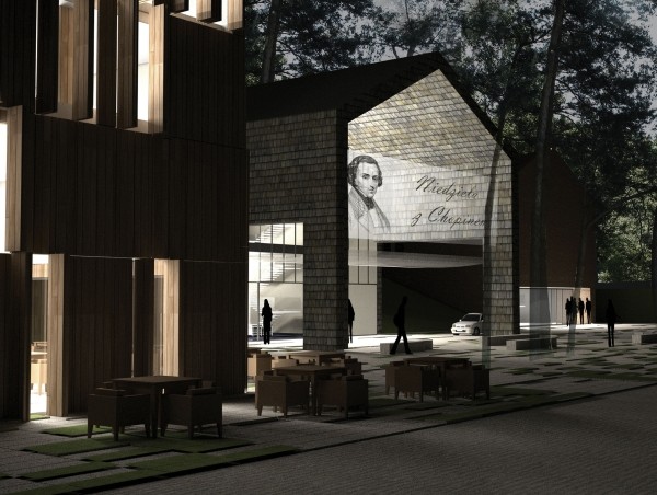 Lokalizacja części funkcji pod zielonymi tarasami pokrytymi trawą umożliwiła optyczne zmniejszenie widocznej kubatury budynku i dostosowanie jej do rytmu i układu obiektów sąsiadujących. Cały układ zaprojektowano tak, żeby kalenice były ułożone pod kątem prostym do drogi dojazdowej i nieznacznie obrócone względem istniejących tu już obiektów. Dzięki temu zabiegowi od strony dojścia do budynku powstało delikatne domknięcie urbanistyczne całego układu przestrzennego tej części skansenu. Utworzone w ten sposób forum ma być synonimem podwórza domostwa i wiejskiego placu, na którym koncentruje się życie ludzi. Zarówno na dziedzińcu, jak i od strony wschodniej projektowanego zespołu pozostawiono klin zieleni. Posadzka została zaprojektowana jako połączenie płyt, kostki granitowej i trawy, co ma dać efekt lekkości i przenikania zieleni, a jednocześnie dawać możliwość intensywnego eksploatowania, m.in. w czasie parkowania w tym miejscu samochodów.