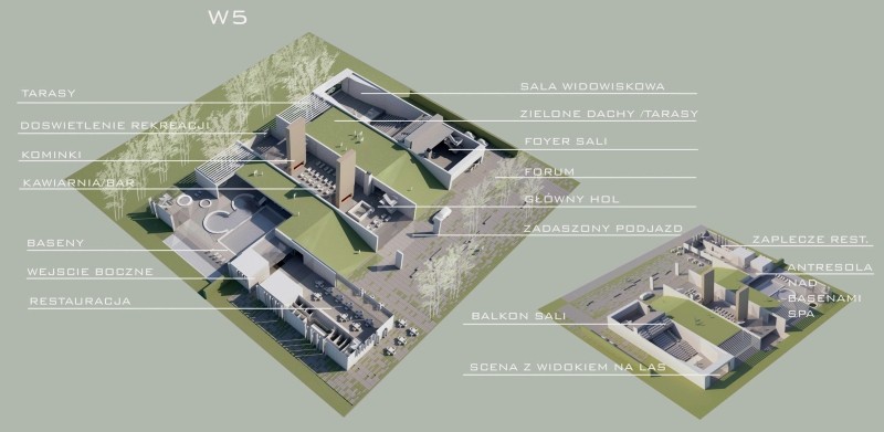 Tę część zespołu zlokalizowano w budynku sąsiadującym z głównym od strony zachodniej – jest z nim połączona szerokim korytarzem pod jedną z zielonych skarp. Znajdzie się tutaj kompleks basenów, saun i gabinetów SPA, umieszczonych na antresoli pływalni, a także hotel, który będzie w stanie pomieścić łącznie 206 osób. Takie zgrupowanie funkcji umożliwia gościom hotelowym łatwy i szybki dostęp do wybranej usługi. W parterze obiektu, w części przy forum znajduje się restauracja, dzięki osobnemu wejściu dostępna również dla gości z zewnątrz. Cała przestrzeń „wody” otwiera się dwoma szklanymi ścianami na las i otoczenie. Otwarcie od strony zachodniej umożliwia dobre doświetlenie tej strefy. Skojarzenia są tutaj przejrzyste – lady barowe i recepcyjne zaprojektowano ze szkła, po ścianach na spływać woda.