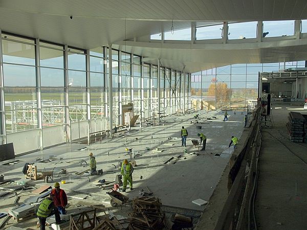 Wewnątrz budynku prace wykończeniowe ruszyły pełną parą. Zamontowano pierwsze ruchome schody, z których będą korzystać pasażerowie nowego terminalu. W hali odlotów na parterze budynku trwa układanie kamiennej podłogi.