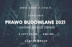 szkolenie - www.canfor.com.plPrawo Budowlane 2021 - najważniejsze zmiany4 luty 2021r. - online19 września 2020 r. weszła w życie ustawa o zmianach w prawie budowlanym. Nowelizacja ma na celu przyspieszenie i uproszczenie całego procesu inwestycyjno-budowlanego. Odpowiadając na potrzebę zapoznania się z nowymi regulacjami, zapraszamy do udziału w szkoleniu podczas którego...