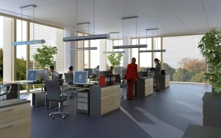 Część biurowa Thespiana znajdować będzie się na pierwszym piętrze. Jej szacowana powierzchnia wyniesie około 2150 mkw. Biura zaprojektowano tutaj w konwencji open space, ale możliwy będzie też podział powierzchni na mniejsze segmenty. Do części biurowej pracownicy będą przechodzić przez reprezentacyjny hol z recepcją. Cały obiekt będzie wyposażony w system monitoringu oraz telewizji przemysłowej.