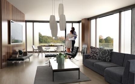 W budynku mieścić się będą 32 klimatyzowane apartamenty o powierzchni od 57 mkw. do ponad 200 mkw. Inwestor – firma ING Real Estate Development Sp. z o.o. – zakłada, że lokale zostaną oddane do użytku w standardzie „pod klucz” – z gotowymi podłogami, stolarką, urządzonymi łazienkami i kuchniami ze sprzętem AGD. Mieszkania zaprojektowano w taki sposób, by dzieliły się one na strefę dzienną i nocną, co w założeniu ma zapewniać ich mieszkańcom dodatkowy komfort. Apartamenty na czwartym, szóstym i ósmym piętrze będą miały dostęp do przestronnych tarasów. Doskonałe doświetlenie mieszkań naturalnym światłem zapewnią w pełni przeszklone fasady z indywidualnie sterowanymi przesłonami przeciwsłonecznymi. W celu zagwarantowania mieszkańcom bezpieczeństwa i wygody część apartamentowa Thespiana będzie niedostępna dla użytkowników biur oraz ich klientów. Do apartamentów prowadzić ma wejście od strony placu oraz ul. Powstańców Śląskich. Dodatkowo specjalnie dla mieszkańców budynku apartamentowego zaprojektowano wewnętrzne patio – dziedziniec przeznaczony do spotkań i odpoczynku.